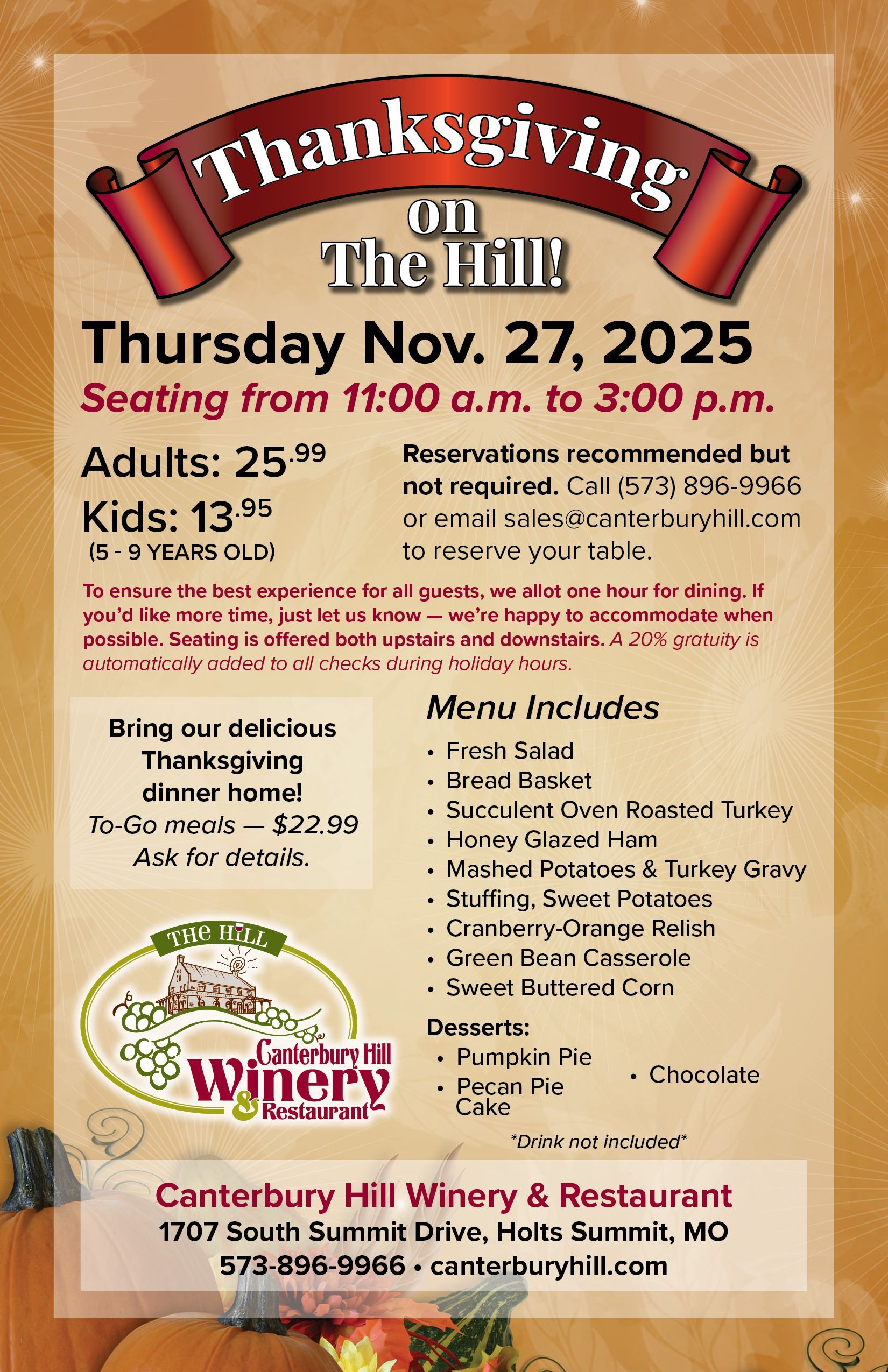 Enjoy a holiday meal or special event at Canterbury Hill Winery & Restaurant in Holts Summit, MO