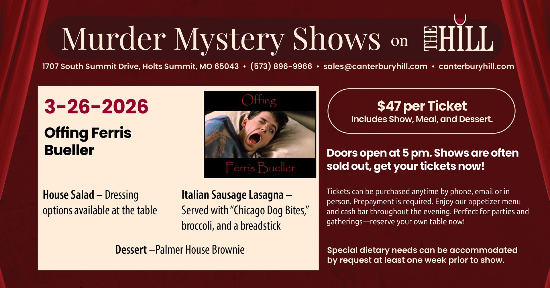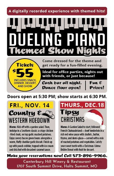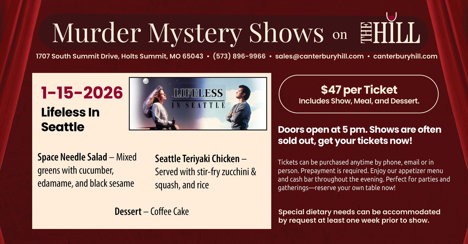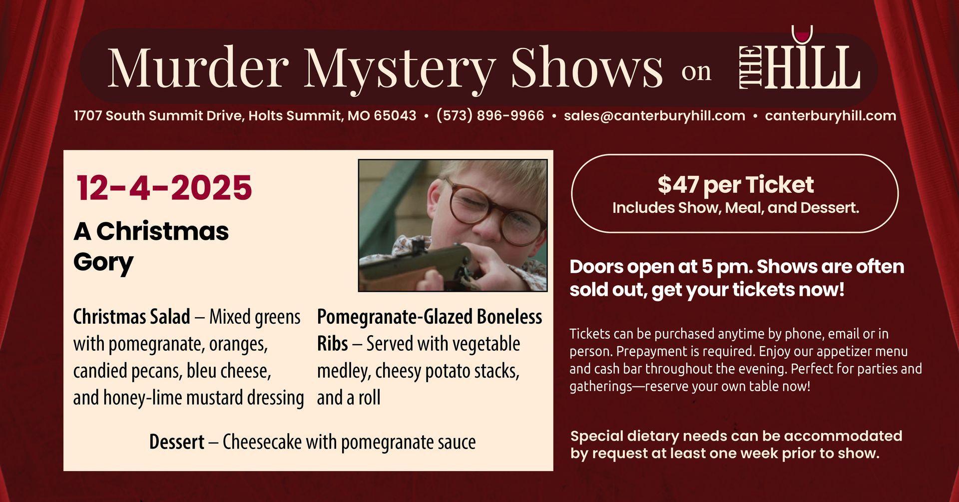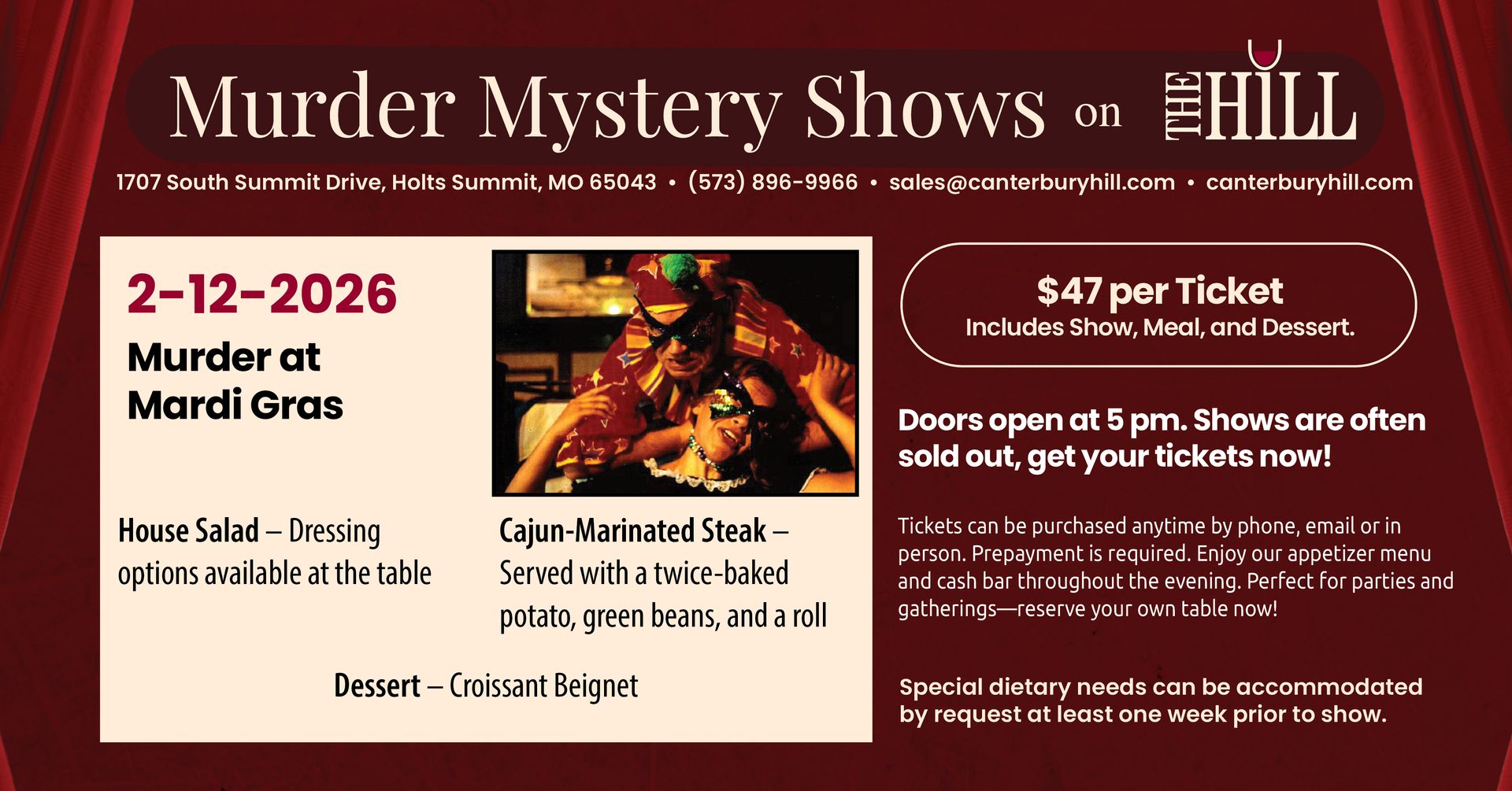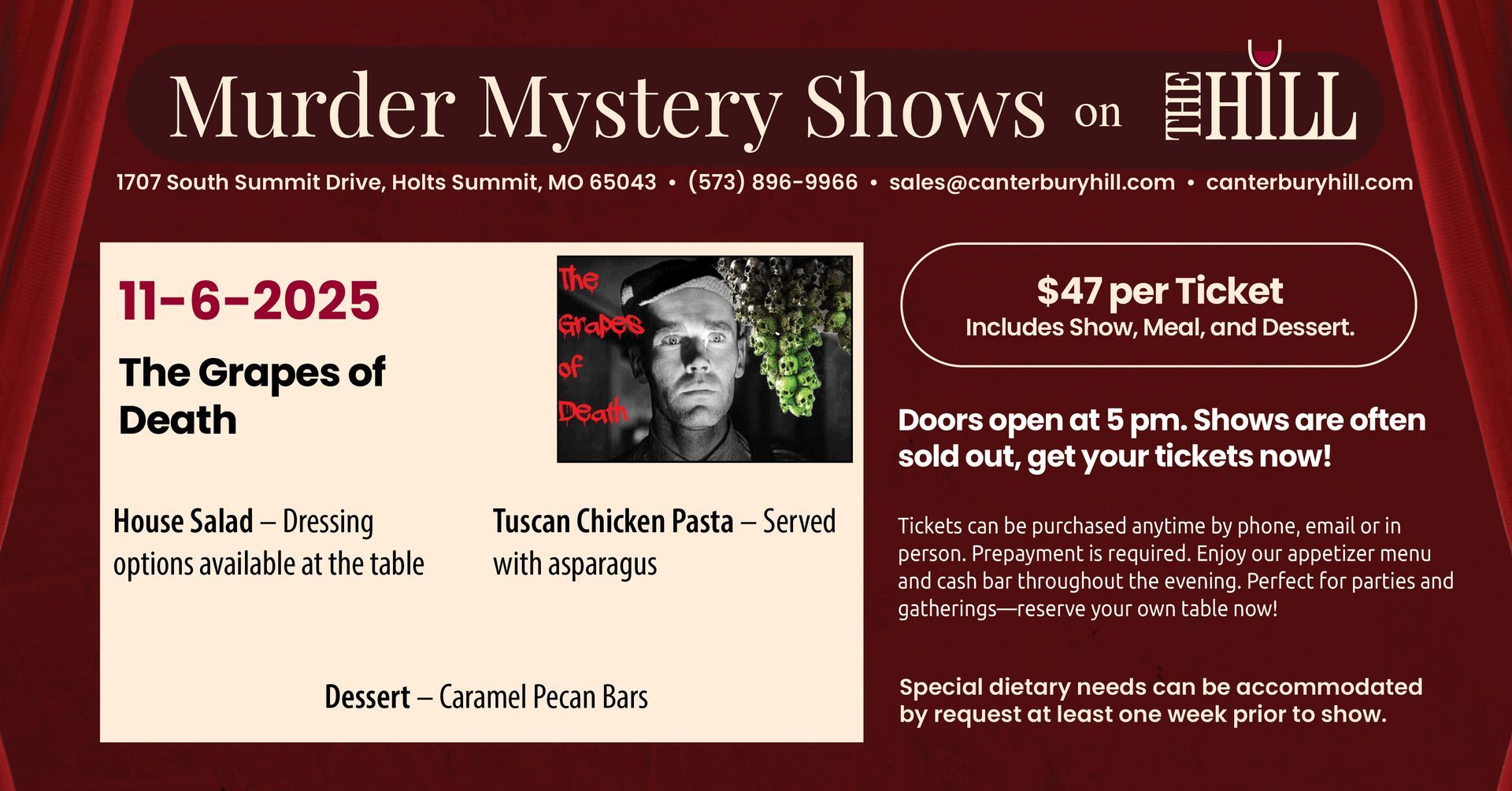 Are you looking for something to spice up your evening in the Jefferson City, MO area? How about a prime location for your next holiday meal with family? Live life to the fullest at Canterbury Hill Winery & Restaurant! We are excited to bring special events like murder mystery dinner shows and delicious holiday gatherings to the heart of Missouri. There is always something new happening at The Hill, so be sure to keep up with our upcoming events.